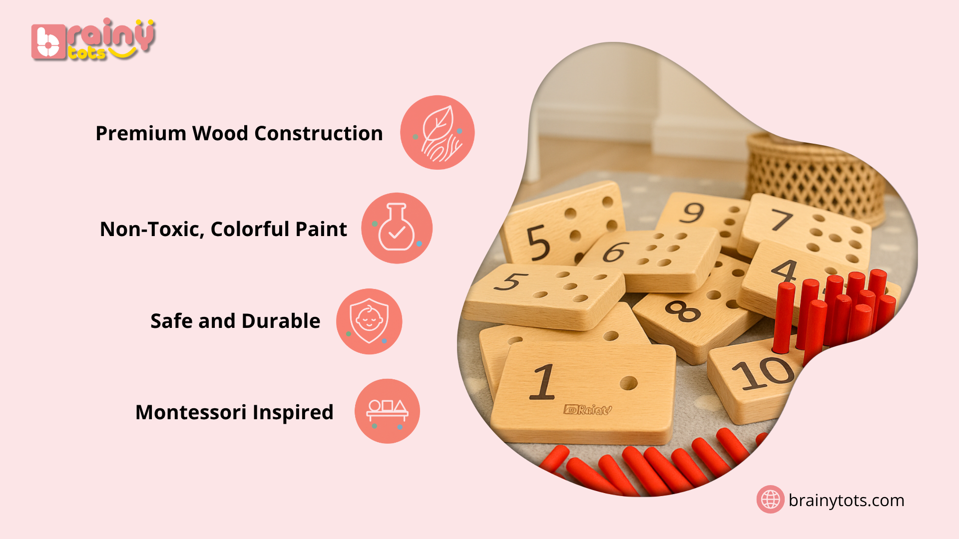 BrainyTots Montessori Counting Peg Board Toy for Kids 1–3 Years | Early Learning Math Activity Set with 10 Wooden Number Board and Pegs , Storage Pouch & Play Guide for Toddler Brain Development